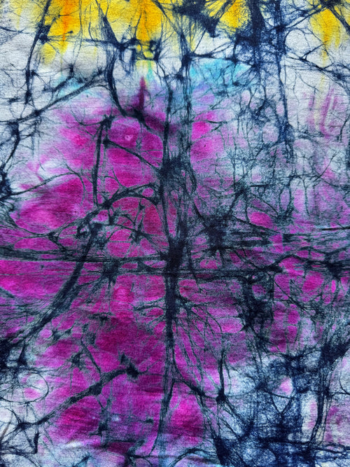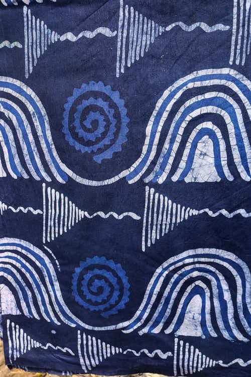 This cloth was made using the traditional wax-resist technique, where hot wax is hand-painted onto the fabric, dyed, and removed layer by layer to build up rich, layered color. Three separate rounds of waxing and dyeing went into creating the depth of blue you see here, moving from soft sky blue through violet into deep indigo.